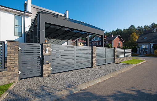 На фото: откатные ворота и калитка с заполнением из алюминиевых профилей шириной 82 мм.
